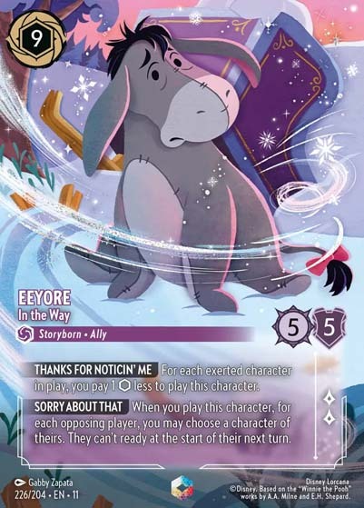 Winterspell #226 THANKS FOR NOTICIN' ME 你的場上每有一張橫置角色,你可減少1費用打出此角色。 | SORRY ABOUT THAT 當你打出此角色,你可以選擇對手一張角色,在對手下個回合開始時不能重置。 |