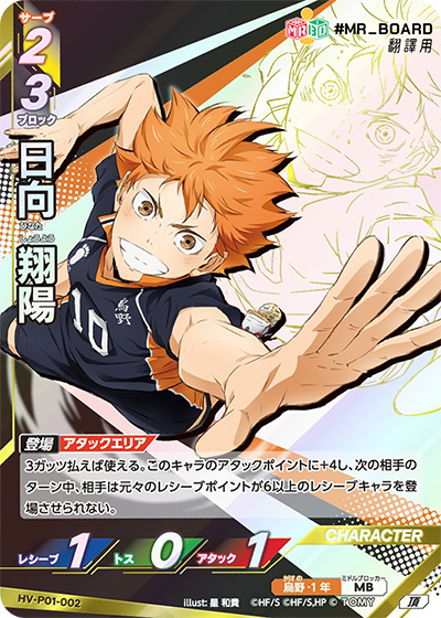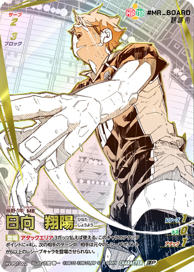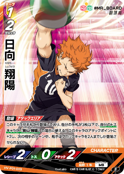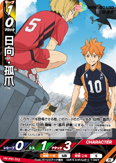 ![]() | HV_P01_072 N 此角登場時,此卡的名稱由「日向.孤爪」改為「日向翔陽」或「孤爪研磨」。 (此卡登場時需立即決定名稱。) |