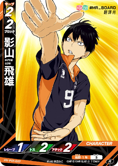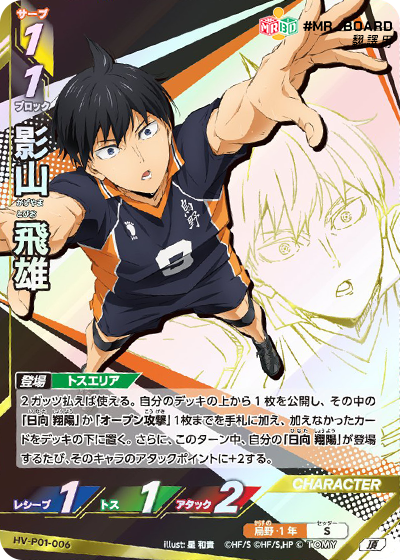 | HV_P01_003 S 登場 攻擊區 當角色從手牌中登場,自己的手牌 3 張或以下,自己的托球角色是「影山飛雄」時發動, 這個角色的攻擊值+2,並且在對手下一回合中,只能打出最多 2 個阻擋角色。 |