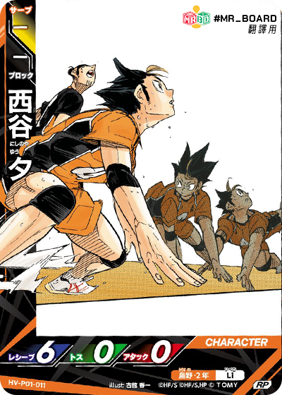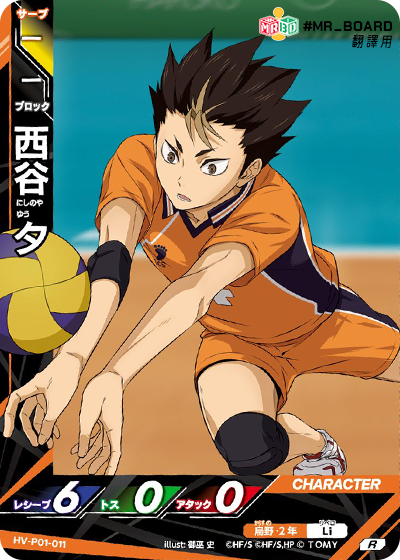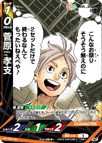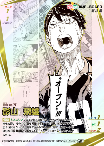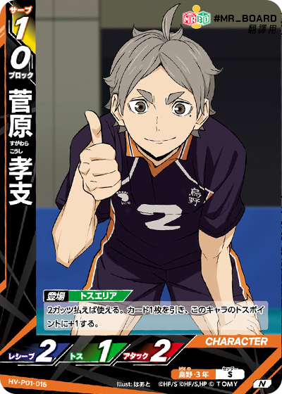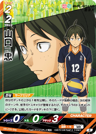 ![]() | HV_P01_010 S 登場 發球區 公開自己牌庫頂1張牌,該卡是烏野時, 下一個對手回合同,對手二傳角色登場時, 該角色二傳值-2。 公開的卡放置到牌庫底。 |