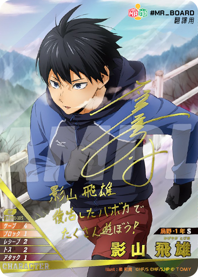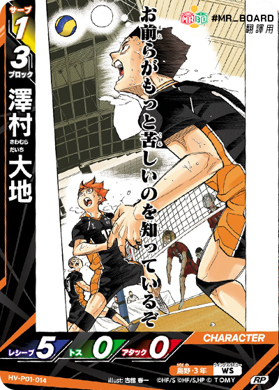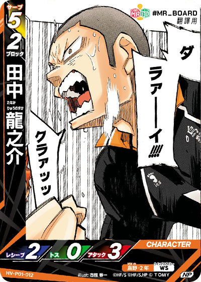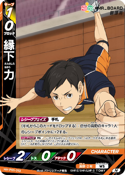 ![]() | HV_P01_013 N 接球階段 手牌 (從手牌中掉棄此卡牌):自己的1個烏野角色的接球值+2。 |