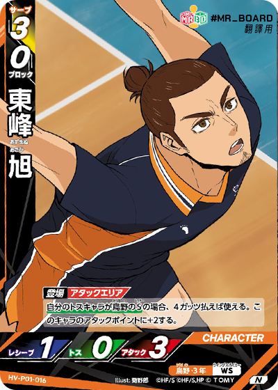 ![]() | HV_P01_016 N 登場 攻擊區 自己的托球角色是烏野的S時,支付 4 Guts 發動。此角色的攻擊值+2。 |