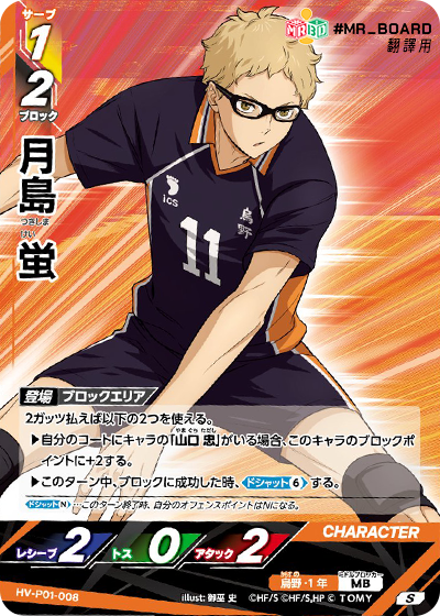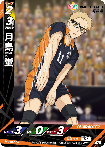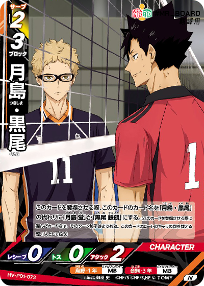 ![]() | HV_P01_072 N 此角登場時,此卡的名稱由「月岛.黒尾」改為「月岛萤」或「黒尾鉄朗」。 (此卡登場時需立即決定名稱。) |