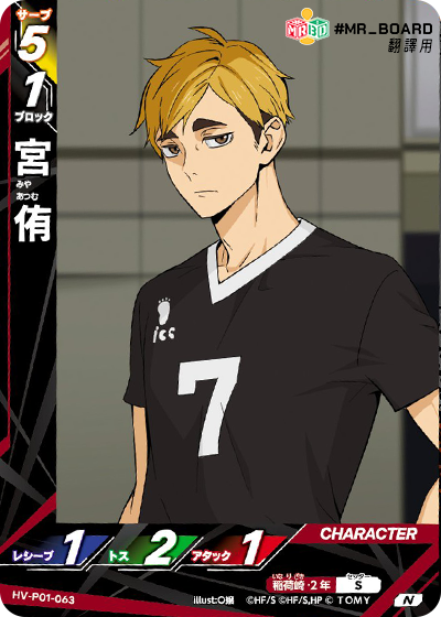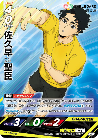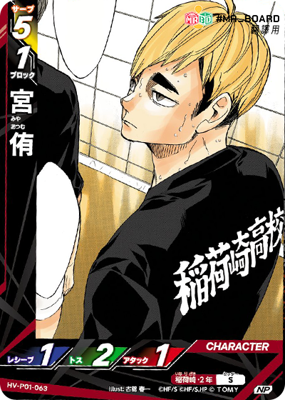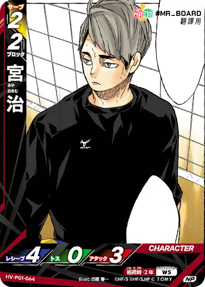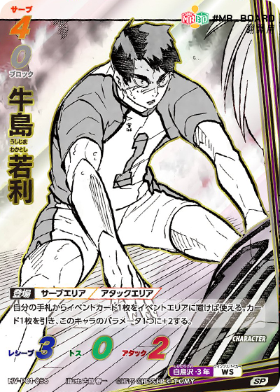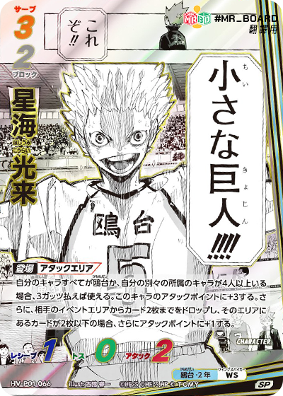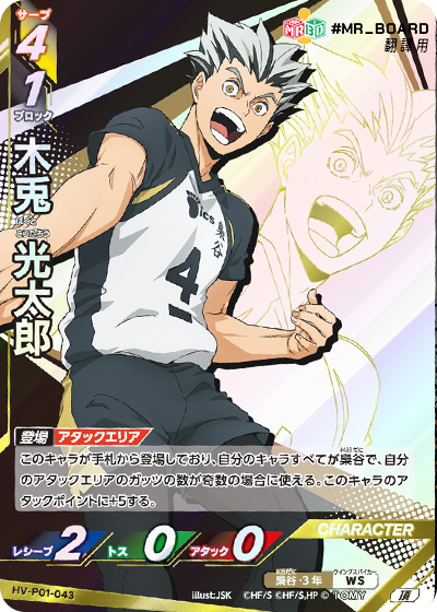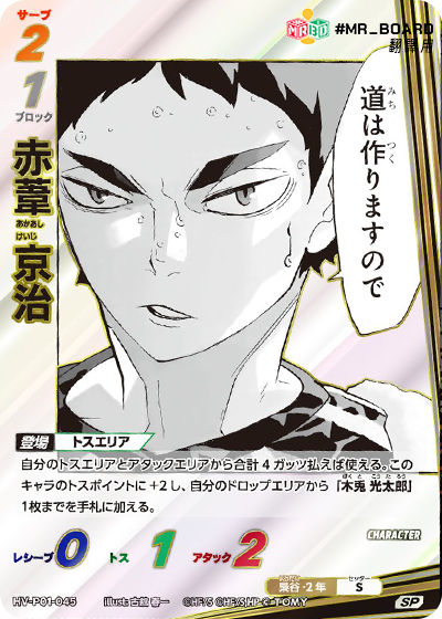 ![]() | HV-P01-045 SP 登場 托球區 支付自己的托球區與攻擊區合計4張Guts發動。 此角色托球值+2,並從棄牌區將「木兎光太郎」加入手牌 |