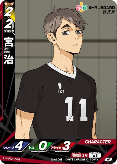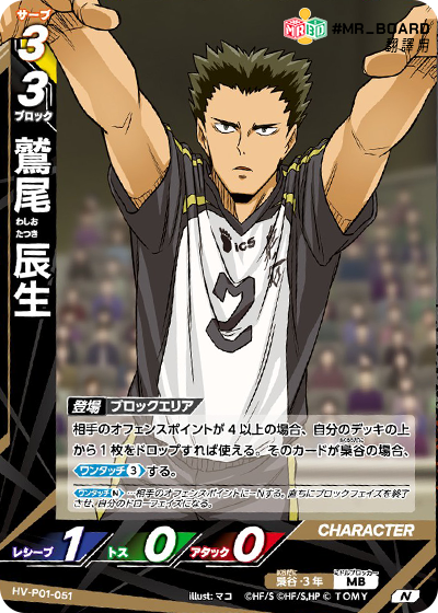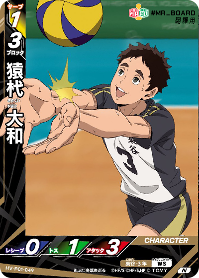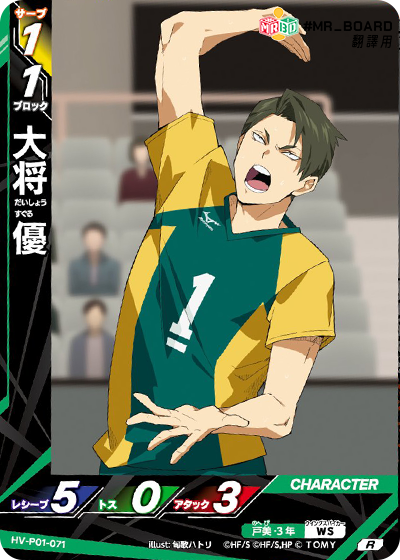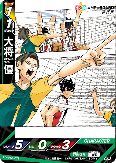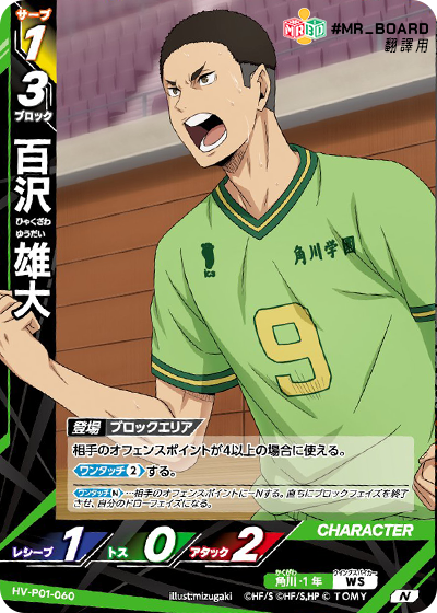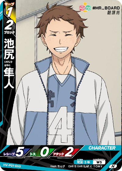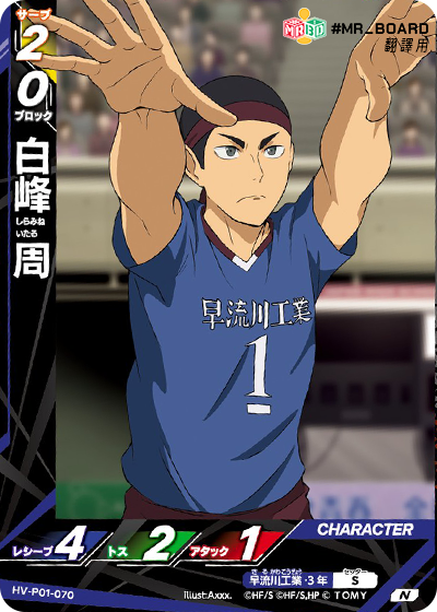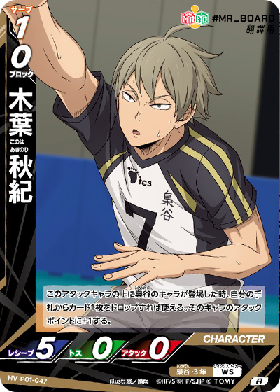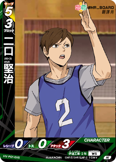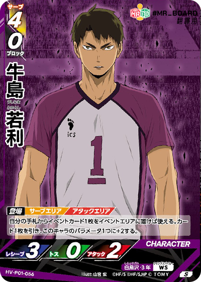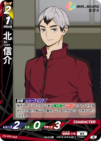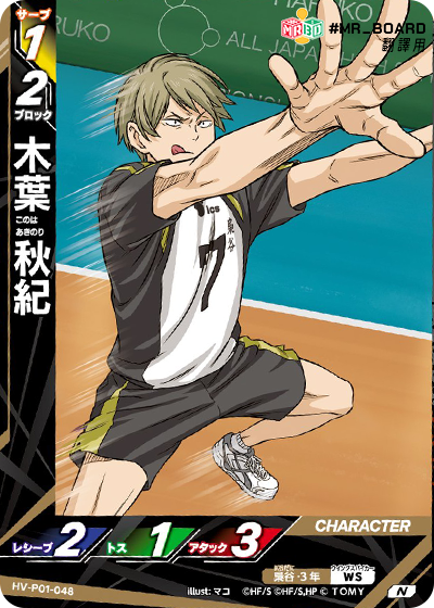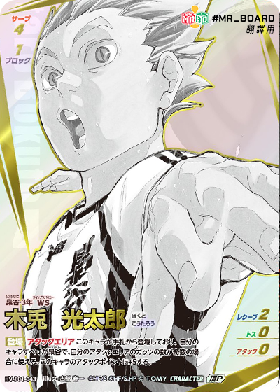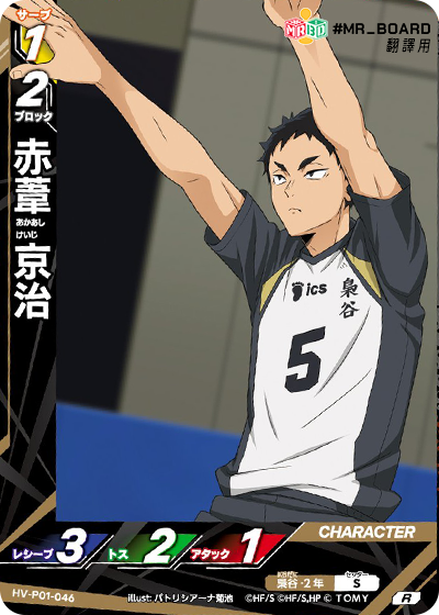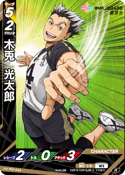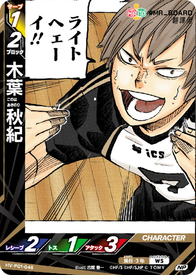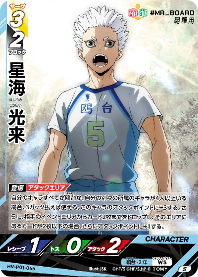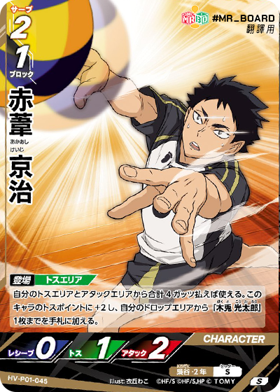 ![]() | HV-P01-045 S 登場 托球區 支付自己的托球區與攻擊區合計4張Guts發動。 此角色托球值+2,並從棄牌區將「木兎光太郎」加入手牌 |