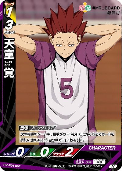 ![]() | HV-P01-043 頂 登場 攻擊區 此角色從手牌登場時,自己場上的角色全是梟谷,自己的攻擊區域的Guts是單數時發動, 此角色攻擊值+5。 |