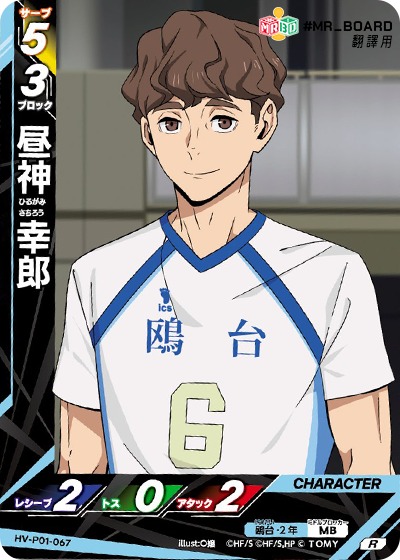 ![]() | HV-P01-065 N 登場 接球區 對手的EVENT區托球及攻擊卡合計5張或以上時,此角色接球值+6。 |