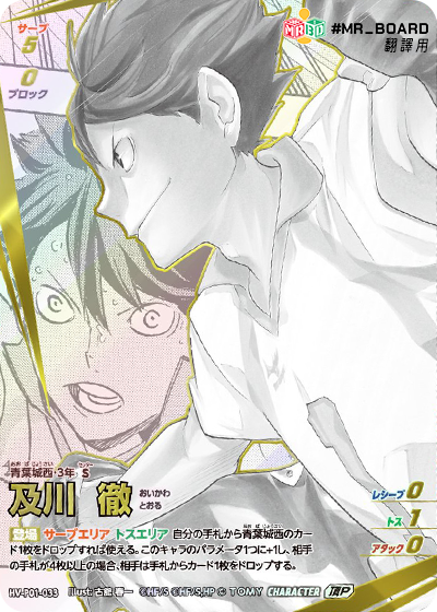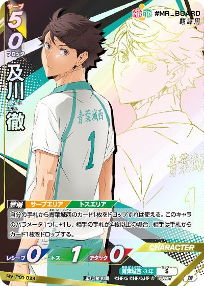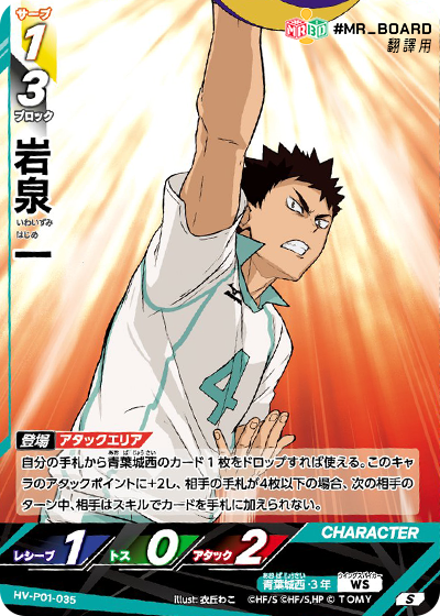 ![]() | HV-P01-033 頂P 登場 發球區 / 托球區 從自己手牌掉棄1張青葉城西的卡發動。 此角色能力值+1, 對手手牌4張或以上時,掉棄對手1張手牌。 |