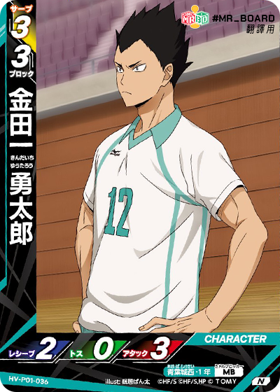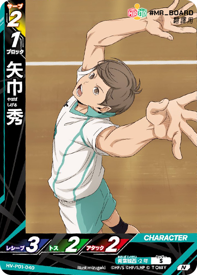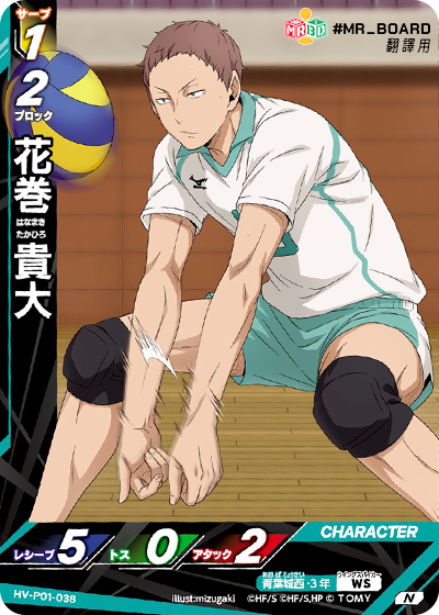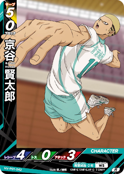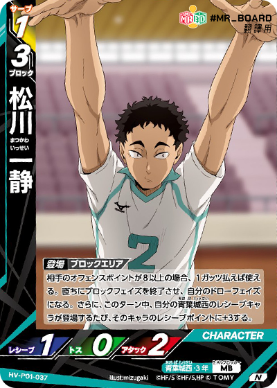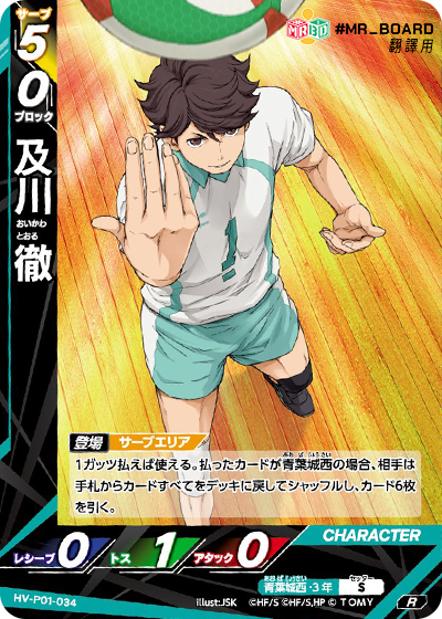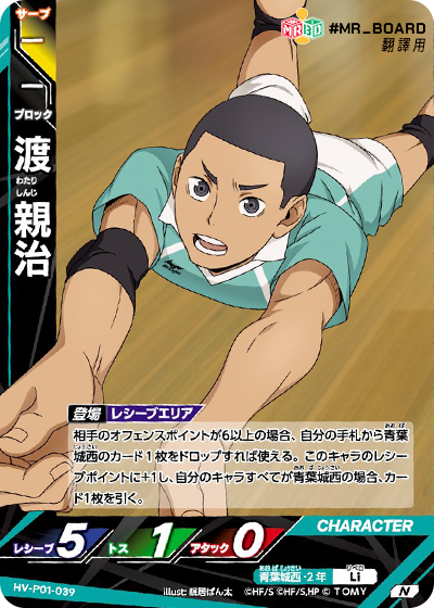 ![]() | HV-P01-039 N 登場 接球區 對手進攻總值6或以上時,從自己手牌掉棄1張青葉城西的卡發動。 此角色的接球值+1, 場上只有青葉城西角色時,抽1張卡。 |