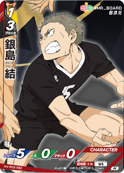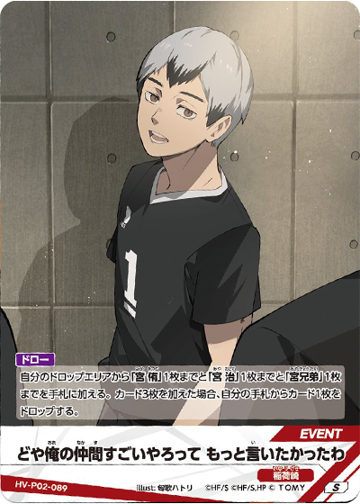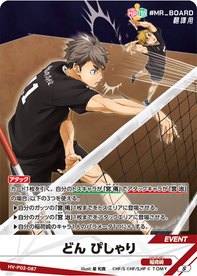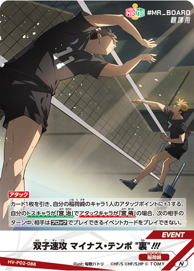 | HV-P02-088 N 所屬: 稲荷崎  | 抽1張卡,自己的1名稲荷崎角色攻擊值+1。 自己的 托球角色是「宮治」 及 攻擊角色是「宮侑」 時, 下個對手回合中,對手不能使用攔網Event卡。 |