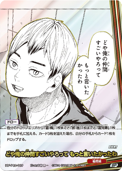 | HV-P02-089 SP 所屬: 稲荷崎  | | 自己棄牌區的最多1張「宮侑」和最多1張「宮治」和最多1張「宮兄弟」加到手牌。如果3張加入手牌時,自己手牌棄1張到棄牌區。 |