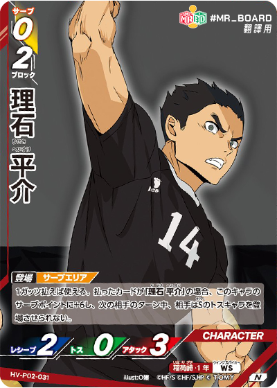 位置: WS  | | 支付 1 Guts 發動。如支付的 Guts 卡是「理石 平介」此角色的發球值+6。下個對手回合中,對手的托球角色不可以登場 [S]。 |