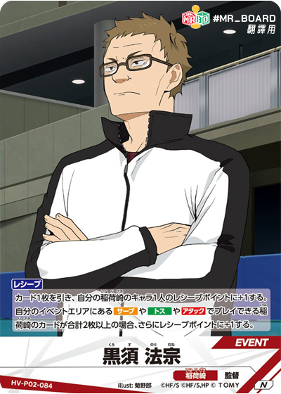| HV-P02-084 N 所屬: 稲荷崎 | 監督  | | 抽1張卡,自己1名稲荷崎角色的接球值+1。自己的EVENT區的發球或托球或攻擊的稲荷崎卡合計2張時,接球值+1。 |