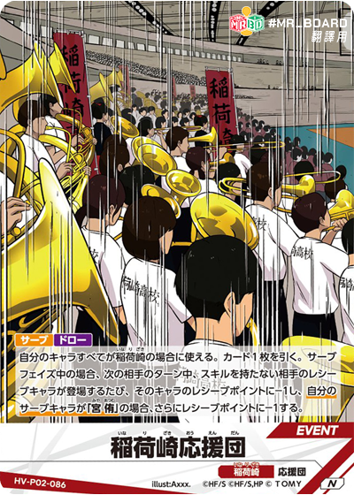 | HV-P02-086 N 所屬: 稲荷崎 | 応援団   | | 自己所有角色均為稲荷崎時發動。抽1張牌。在發球階段時,下一個對手回合中,對手登場沒有效果的接球角色時,該角色接球值-1,自己發球角色是「宮侑」時,接球值-1。 |