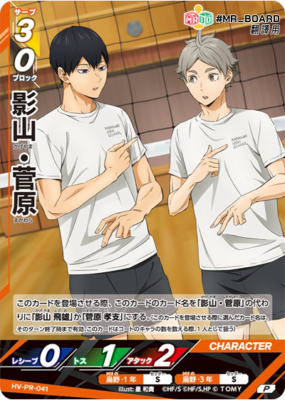 位置: S 此卡登場時,此卡的名稱由「影山.菅原」改為「影山 飛雄」或「菅原 孝支」。 (放置此卡時選擇的名稱在本回合結束前有效。計算場上角色數量時,此卡計為1個角色。) |