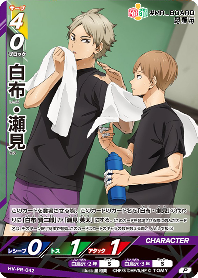 位置: S 此卡登場時,此卡的名稱由「白布.瀬見」改為「白布 賢二郎」或「瀬見 英太」。 (放置此卡時選擇的名稱在本回合結束前有效。計算場上角色數量時,此卡計為1個角色。) |