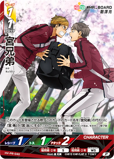 位置: WS 此卡登場時,此卡的名稱由「宮兄弟」改為「宫侑」或「宮治」。 (放置此卡時選擇的名稱在本回合結束前有效。計算場上角色數量時,此卡計為1個角色。) |