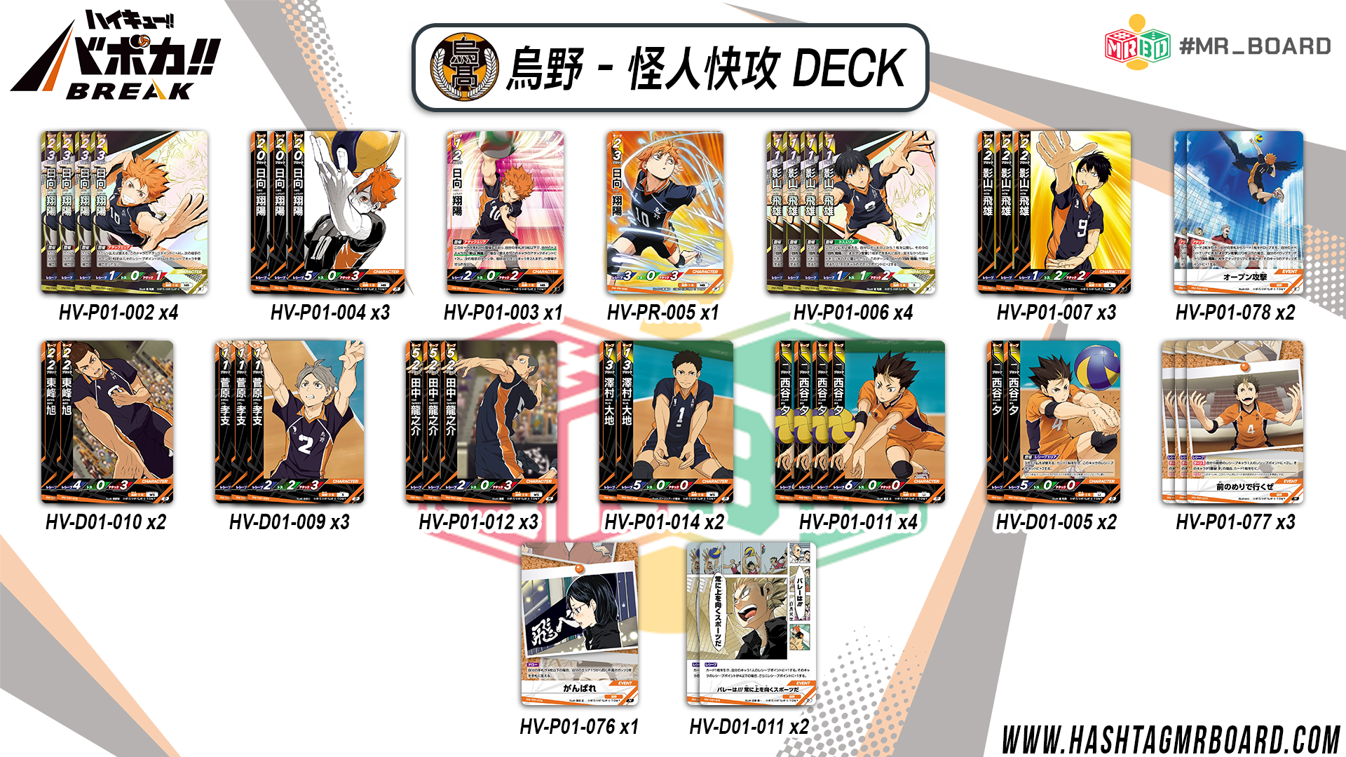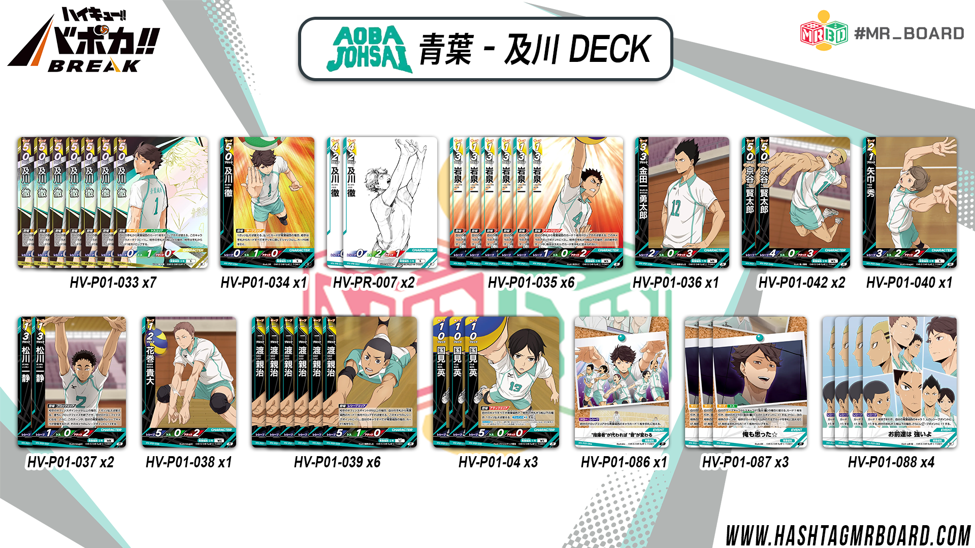 以頂 - 及川 做發球同二傳,開效唔洗用Guts,只需要掉手牌,所以能夠喺一開始就發效進攻。再用1 0 2 岩泉掉手牌發效,令對手無得補手牌,嘅同時自己可以補手牌。打出資源差取得優勢。因為無太多回收資源嘅手段,適合喜歡有前無後嘅朋友。