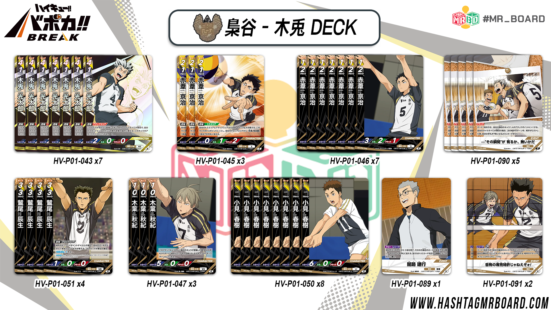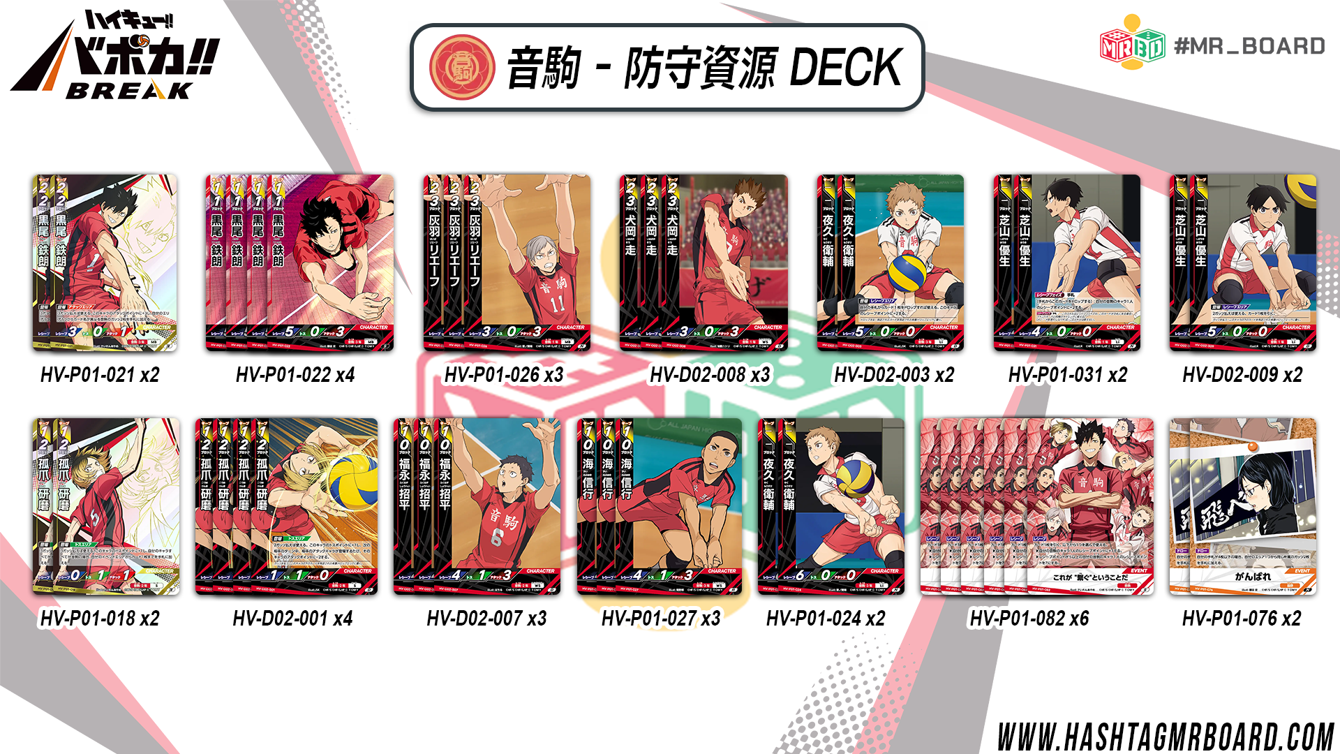以防守見稱嘅音駒,數量較多可以接到5或6嘅球員,喺接球時有更多嘅選擇。加上 1 1 0嘅研磨甩Guts發效,能夠令對手進攻值減低,可以用灰羽或犬岡攔網,或輕鬆接球。喺無手牌時可以用 學姐Event 回收場上Guts重用,之後再用 頂 - 研磨回收學姐Event或防守Event重用,最後手段用黑尾再回收場上Guts重用。主打防守+資源,令對手用哂啲牌,自己就仲有牌可以用。適合有耐性防守等機會嘅朋友。