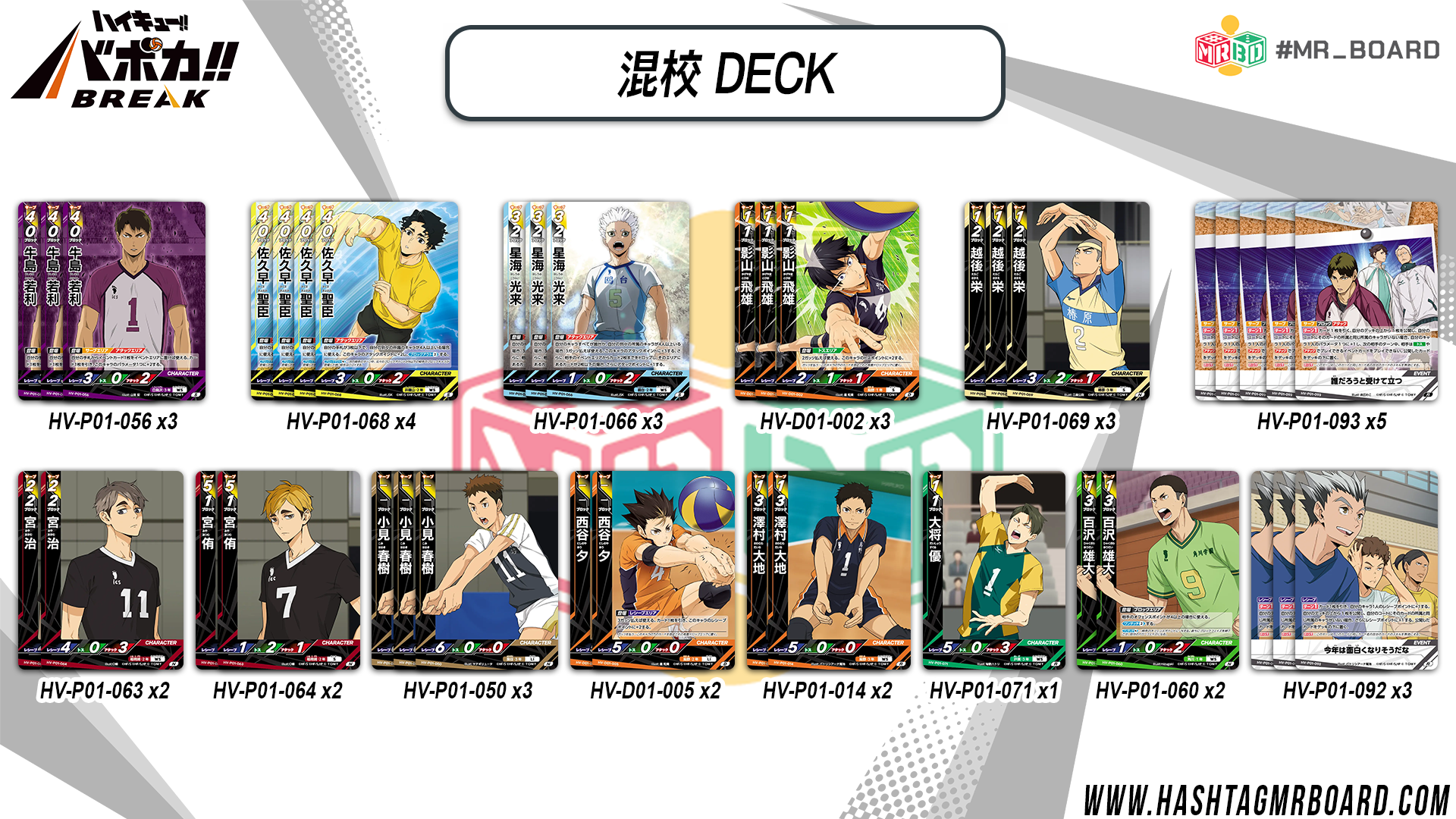 混校砌法最大好處係可以用各校嘅強球員,但同時缺點係運氣成份連高。大部分嘅大力進攻手段或者接球都需要從Deck頂開卡,睇有無撞自己場上嘅學校至可以發效,同時星海需要4間學校在場至可以發效。正因為咁打出球員時,需要考慮令自己球員處於不同學校。以牛島同佐久早做前期進攻手段,儲夠Guts就打出星海加Event,打出最大進攻值。適合鍾意賭運嘅朋友。