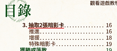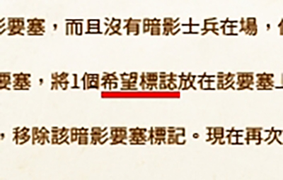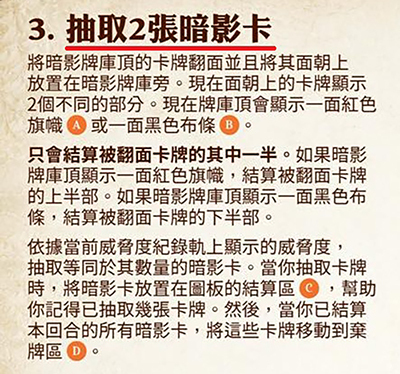 特此說明規則書P2和P16的標題「抽取2張暗影卡」為誤植,正確敘述為「抽取暗影卡」;規則書P2角色棋子圖示的標題「13張角色卡」為誤植,正確敘述為「13個角色棋子」;P14的佔領敘述第三行「希望標誌」為誤植,正確敘述為「避風港標記」,官網線上中文規則說明書已更正,請參考此線上說明書遊玩。