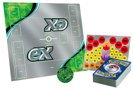 包含了1張「寶可夢ex」的牌組(60張卡牌)、傷害指示物、標記、寶可夢硬幣、